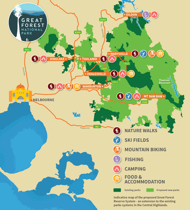 The park network will support regional tourism in local communities such as Kinglake, Toolangi, Eildon, Taggerty, Buxton, Narbethong, Marysville, Alexandra, Warburton, Yarra Junction, Noojee, Yea and Powelltown.