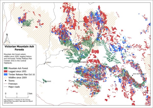 MAP: Logging since 1955 and wildfires since 2009 across the Central Highlands, with VicForests Timber Release Plan Oct 2016 overlayed showing areas available for logging for the next 3 to 5 years.