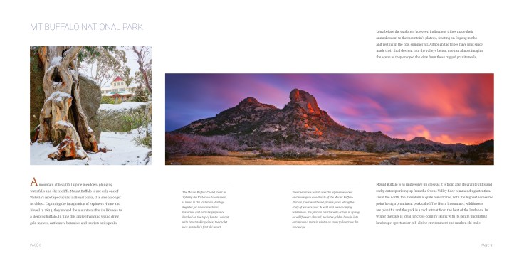 In New South Wales readers will be transported to the country’s highest peaks running along the spine of the Great Dividing Range and the stark beauty of the Kosciuszko Main Range, while in Victoria the state’s loftiest peaks are captured in magnificent detail, from the remote Mt Bogong to the winter playgrounds of Mt Buller and Mt Hotham.