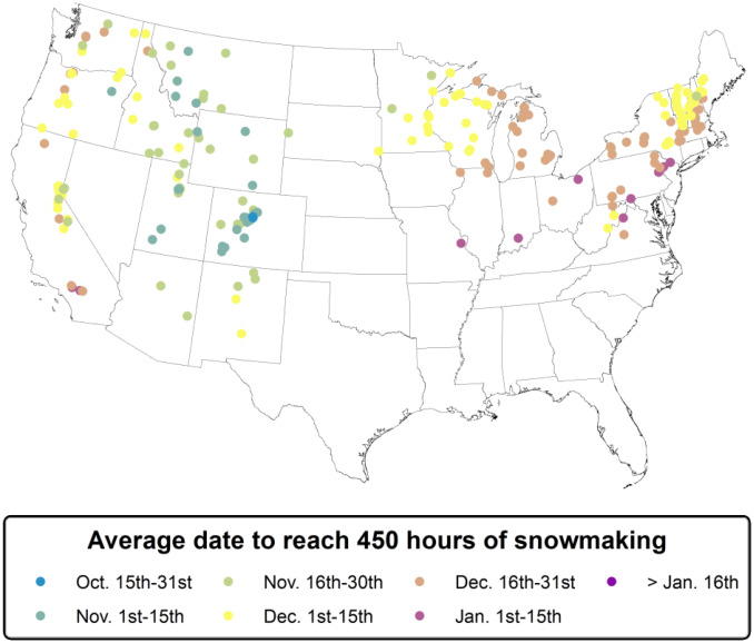 She uses data that was released in 2017 that shows that resorts will need to do more snow making earlier. The image above shows the average projected date from opening of the ski season to reach 450 hrs of snowmaking – Credit Wobus et al. 2017
