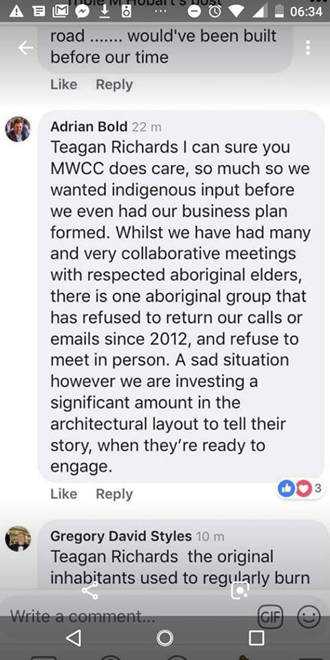Last year MWCC dropped the subterfuge of inclusiveness and defiantly announced that the company would “win the war” with the community which it hypocritically called “corporate terrorists”. The MWCC has referred to the proposed development site on public parkland, for which no development application has been submitted, as “its site” revealing the companies sense of ownership and entitlement. Recently Adrian Bold referred to the local indigenous community stating that “we are investing a significant amount in the architectural layout to tell their story, when they are ready to engage”.