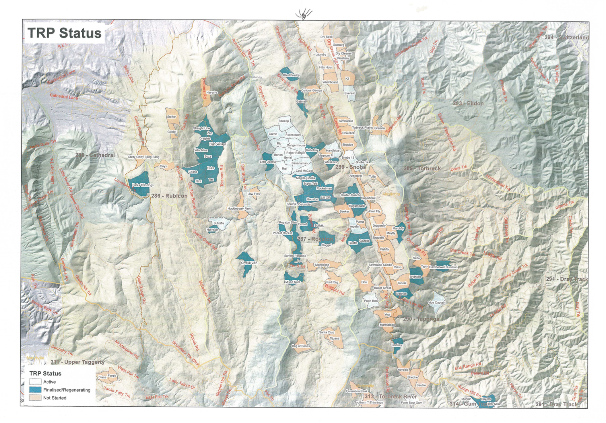 In recent decades this logging has been intense in the northern sections of the Central Highlands, to the east of the well known Cathedral Range, which is popular with bushwalkers and rock climbers. The Blue Range and Royston Range have been heavily logged, causing significant fragmentation of Mountain and Alpine Ash forests. Now logging is being intensified in the Snobs Creek Valley.