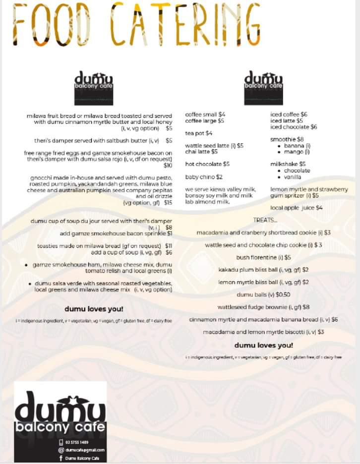 And DUMU Balcony Café, a social enterprise café in Bright, can offer catering providing a specialized native food experience for lunch.
