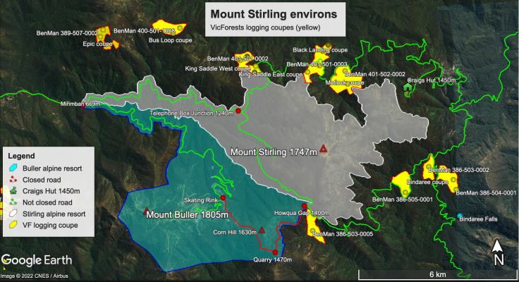 A considerable number of areas of forest on and around Mt Stirling are due to be logged soon (November 2022 onwards). This will have significant impacts on tourism (a number of the areas will be cut along the popular Circuit Road), will further fragment the important alpine ash forests on the mountain, and threaten the viability of older alpine ash and snow gum forests upslope due to the highly flammable nature of logging regrowth..