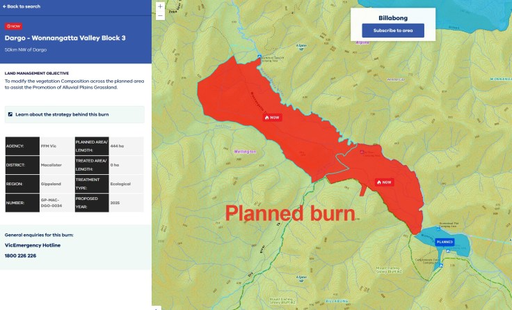 DEECA have confirmed that a planned burn has escaped. There were 2 planned burns happening there in previous days. These were listed as ‘ecological burns’, intended to keep grassy plains in the valley bottom open.