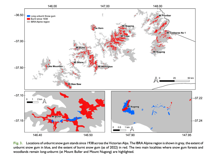 A great starting point is this work from John Morgan, Michael Shackleton and Zac Walker at Latrobe University: ‘Long-unburnt stands of snow gum (Eucalyptus pauciflora Sieber ex Spreng) are exceedingly rare in the Victorian Alps: implications for their conservation and management.’ You can find their paper here. It includes maps of the remaining areas of older snow gum forests across the Victorian high country (see below).