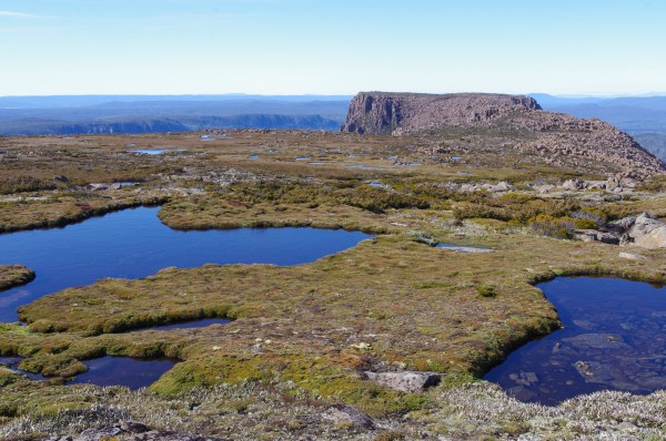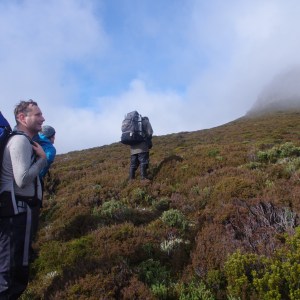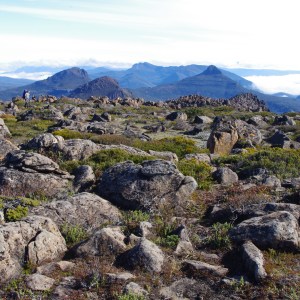 Take the final scramble to the summit plateau, then continue on towards the southern peak through a wonderland – completely alpine country, dotted with shallow tarns and with incredible views – to the far end of the summit plateau. Note that this is largely dominated by cushion plants so please fan out to minimise damage to these fragile plants.