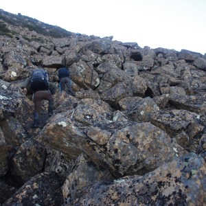 From camp, there is an obvious ridgeline and boulderfild blocking your route. Start climbing the boulderfield, to the initial high point, then via the easiest route to the top of the field. Allow about 90 minutes for this section. We found that as we climbed higher it was slightly easier if we veered right into the shallow gully. You will emerge eventually onto the top of the ridge, with Lamonts Lookout to your left and the summit another 10 mins scramble above you on your right. The views from here are superb. It will probably take around 90 minutes from camp to get to the ridge.