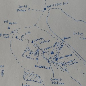 From camp, there is an obvious ridgeline and boulderfild blocking your route. Start climbing the boulderfield, to the initial high point, then via the easiest route to the top of the field. Allow about 90 minutes for this section. We found that as we climbed higher it was slightly easier if we veered right into the shallow gully. You will emerge eventually onto the top of the ridge, with Lamonts Lookout to your left and the summit another 10 mins scramble above you on your right. The views from here are superb. It will probably take around 90 minutes from camp to get to the ridge.