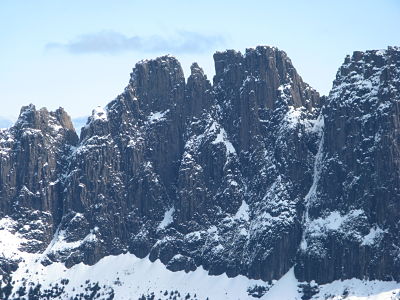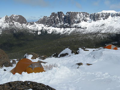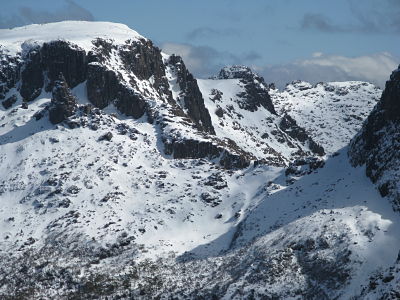 The ‘traverse’ is generally seen as being the walk/ snowshoe from Ducane Gap, on the Overland Track, over Castle Crag and Mt Massif, into Big Gun Pass, and then exiting onto the Ducane Range proper. From here you head out past the Pool of Memories and down to the head of Pine Valley via the Geryon climbers camp, or through the Labyrinth to the Parthenon track that takes you to Pine Valley hut. From here it is a three hour walk to Narcissus hut on Lake St Clair.