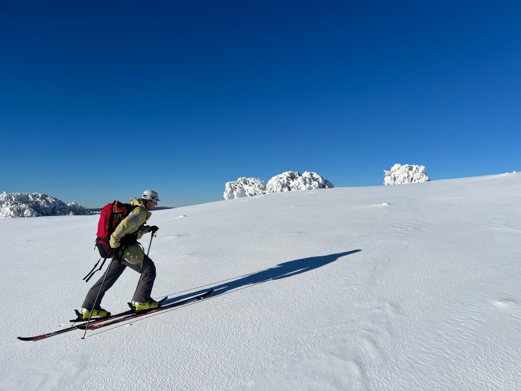 The ski from near Mount Lovick to Bluff hut saddle is mostly through snow gum, there is a 4WD track that is normally pretty obvious. If you have the time there are some good runs to check out – eg southern slopes of the big obvious slope below Mt Lovick, where you get great views of Mt McDonald.