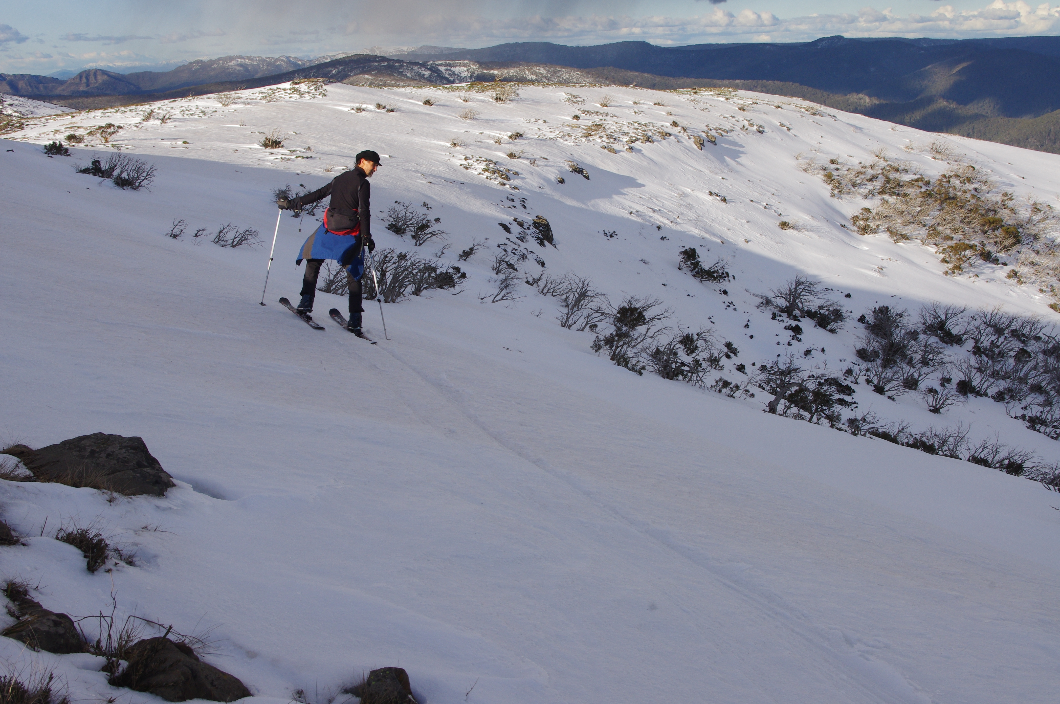 This is an iconic ridgeline, often nastily icy and windblown, with bluffy cliffs along much of the west side and deep, deep gullies dropping into the Terrible Hollow and upper Wonnangatta on the eastside. Some of the best big drops can be found on this side (leeward to the wind, often holding snow way down into the gullies after big dumps). It is definitely worth checking out the top of Stanley Name Spur to see what condition it is in. This is serious terrain, similar to the steeper sections of The Razorback, and rescue could be slow if something goes wrong, so stay within your limits. Assess slopes for avalanche risk, and be aware that cornices can form along sections of the Crosscut. It can be very dangerous in icy conditions.