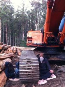 “There are two people locked onto a harvester at Leos Foot, Toolangi.. I’d like to say its a good morning but we’ve all just been assaulted by a few log truck drivers. Lock ons are hanging in there. One wallaby down, hit in the face. Three wallabies shaken but not hurt. Come on down and show your support if you can.”