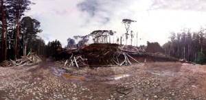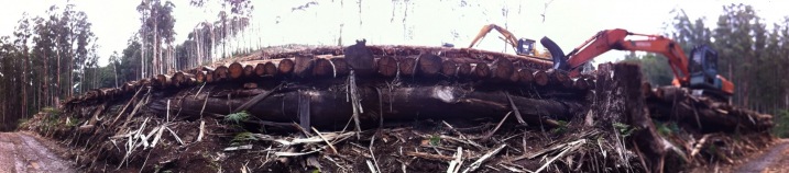 Today the clear-felling is being held off by two individuals who have their arms locked through the tracks of a log-harvester.