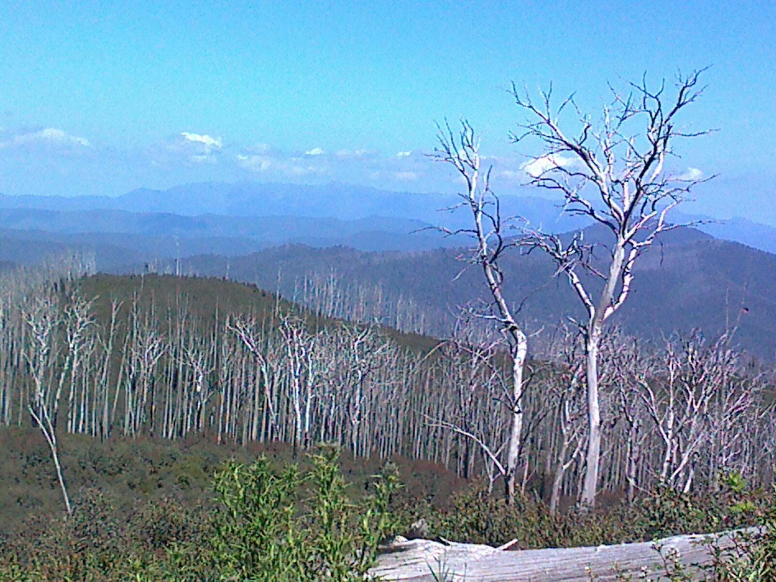 The North West Spur fire burnt hot up and out of the Upper East Ovens valley, over the St Bernard – Sugarloaf ridge, killing a lot of the remaining Alpine Ash forests along the upper sections of the Great Alpine Road that had survived previous fires, and snow gum forests at higher elevations.